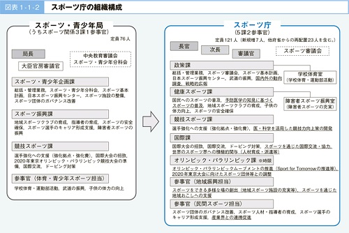 文部科学省スポーツ庁とは、平成23年スポーツ基本法制定や2020年東京オリンピック開催決定を背景とし、平成26年6月に新たに設置っされた部署である。そのなかには、健康スポーツ課というものがあり、国民へのスポーツの普及、予防医学の見地に基づくスポーツの普及、子供の体力向上などを行う部署とされているが、そのなかにはスポーツの安全確保という項目もあり、これは学生スポーツにおける安全確保を目指すこの政策を行うのには、最適な部署であると考える。しかし、現状スポーツ庁の政策としては、オリンピックに向けたスポーツ振興策がほとんどで、安全確保については動きがない。スポーツ庁に求めたい働きは大きく3つある。
